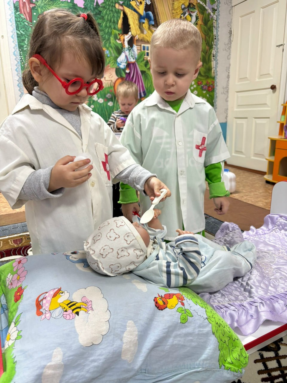 В младшей группе «Звоночки» Новоазовского детского сада №2 «Кораблик» дети ежедневно открывают для себя удивительный мир профессии. Каждый день здесь появляются новые герои: врачи, медсёстры и пациенты — ими становятся любимые игрушки малышей.