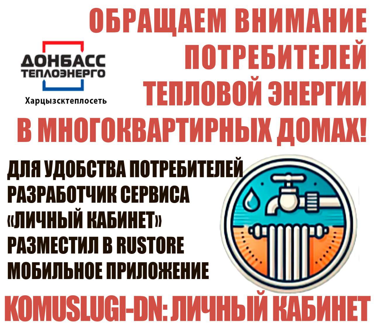 Филиал "Харцызсктеплосеть" ГУП ДНР "Донбасстеплоэнерго" обращает внимание жителей многоквартирных домов на приложение komuslugi-dn.ru «Личный кабинет».