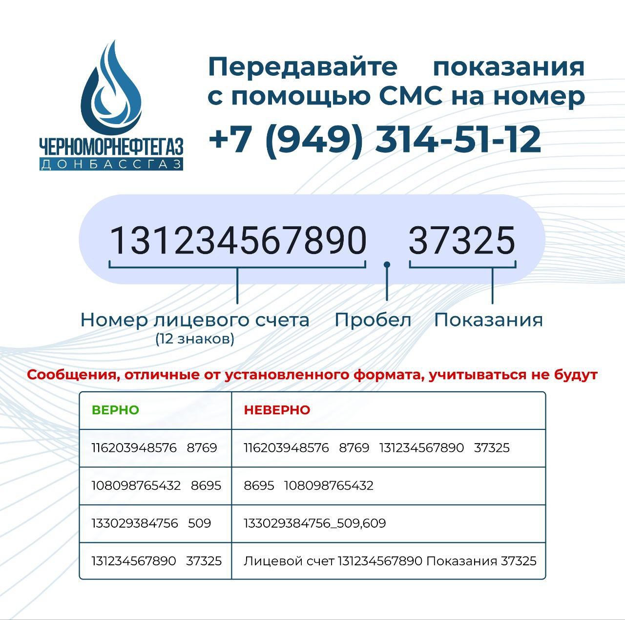 Обращаем Ваше внимание, что СМС-сообщения, не соответствующие указанному формату, в учет приниматься не будет.