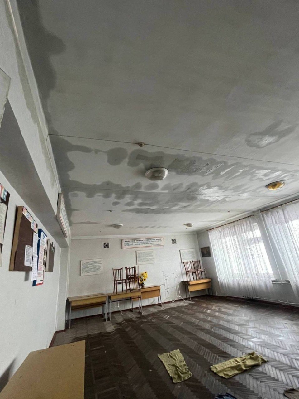 Потолочные плитки валятся на столы, полы залиты, а стены вскоре будут «украшены» плесенью. К этому добавляется холод и стойкий запах сырости. По словам местных, несмотря на аварийное состояние кабинетов, пары никто не отменял. Студенты продолжают грызть гранит науки в учебном заведении.