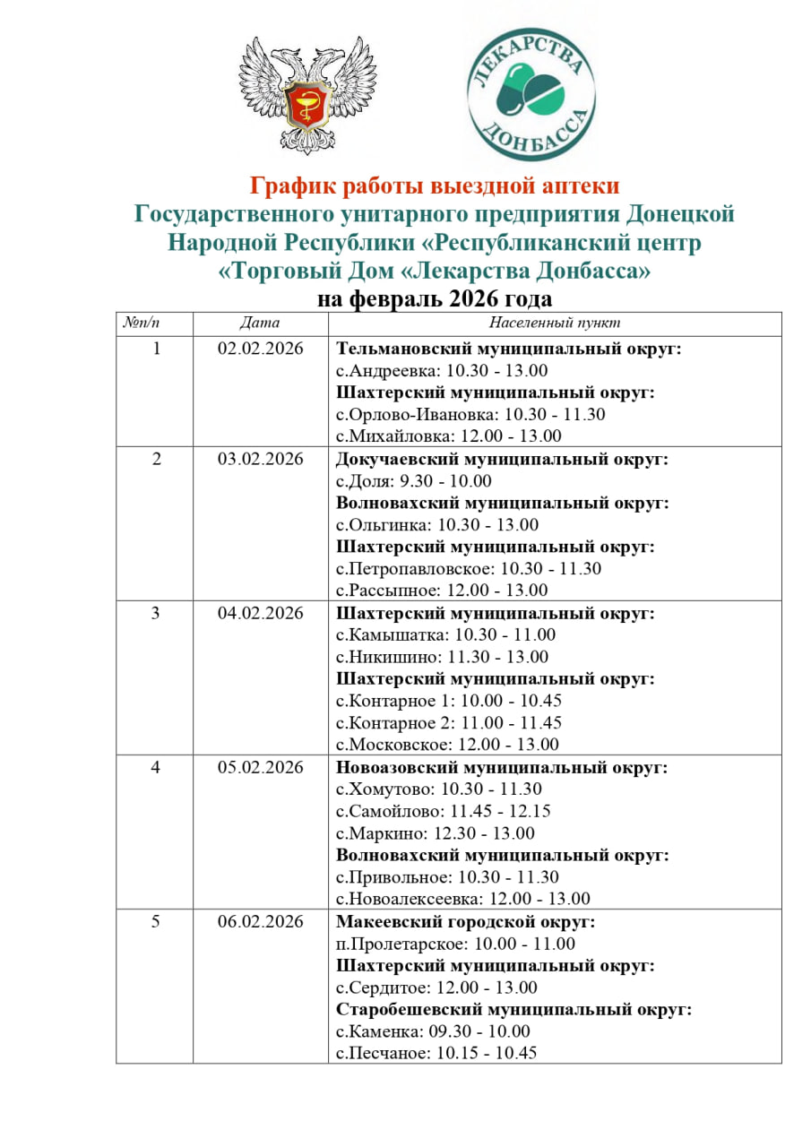 Минздравом ДНР утвержден график выезда автоаптек на февраль в населенные пункты городских округов Мариуполь, Макеевка, Дебальцево, а также в Амвросиевский, Волновахский, Докучаевский, Новоазовский, Старобешевский, Тельмановский, Шахтерский и Ясиноватский муниципальные округа.