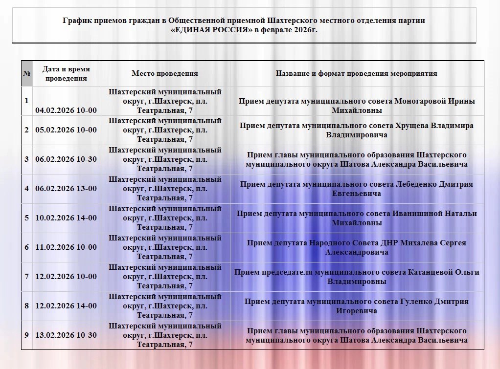 График приемов граждан в местной общественной приемной Шахтерского местного отделения партии «ЕДИНАЯ РОССИЯ» в феврале 2026 года
