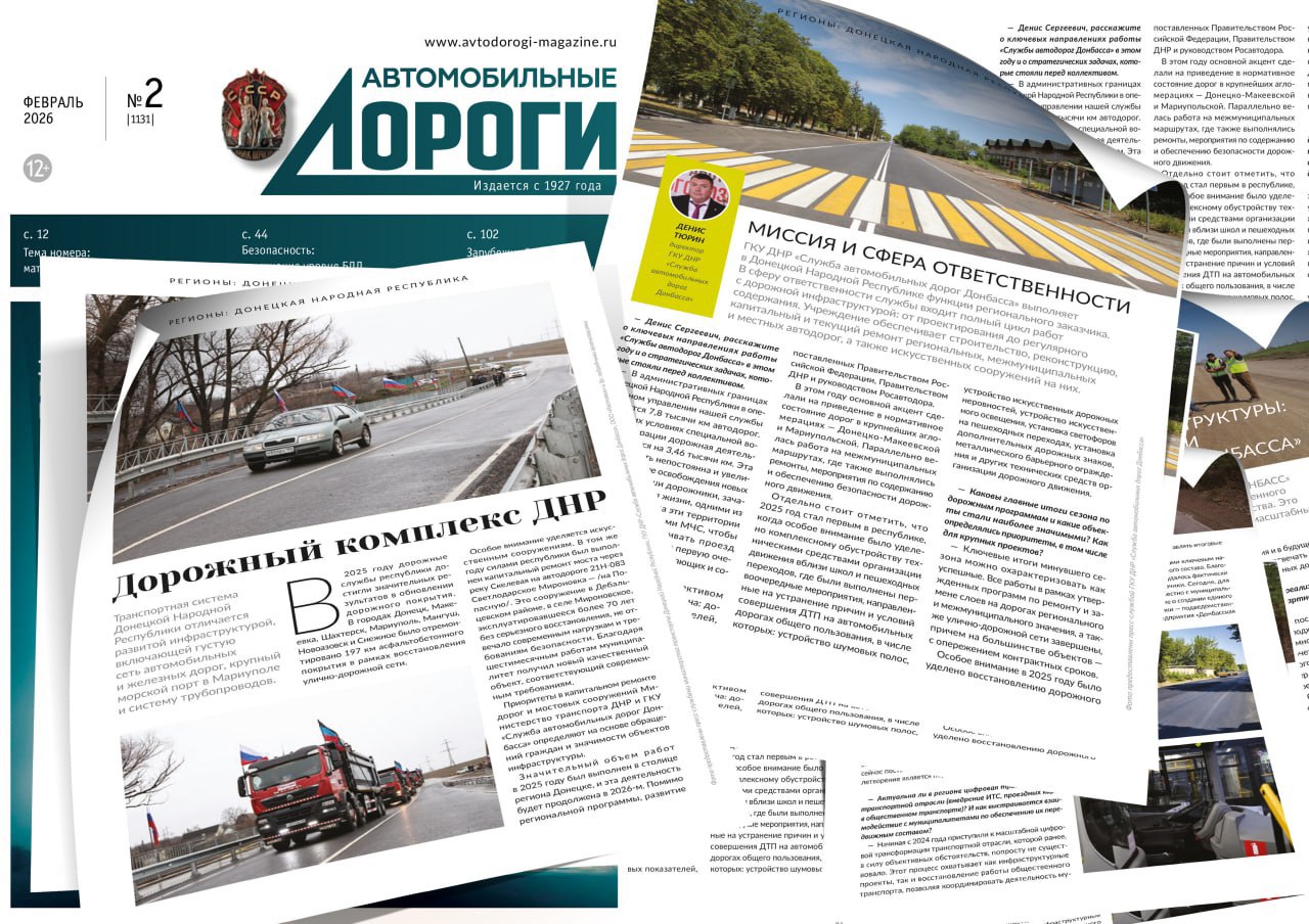 Подробнее о работе дорожной отрасли в ДНР – в интервью директора ГКУ ДНР «Служба автомобильных Дорог Донбасса» Дениса ТЮРИНА журналу "Автомобильные дороги".