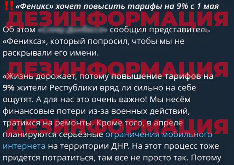 Выявлены случаи повторного распространения в Сети фейков о весеннем повышении тарифов на услуги оператора "Феникс", подготовке к отключению мобильного интернета и введении штрафов за снятие ограничений с неверифицированных SIM-карт.