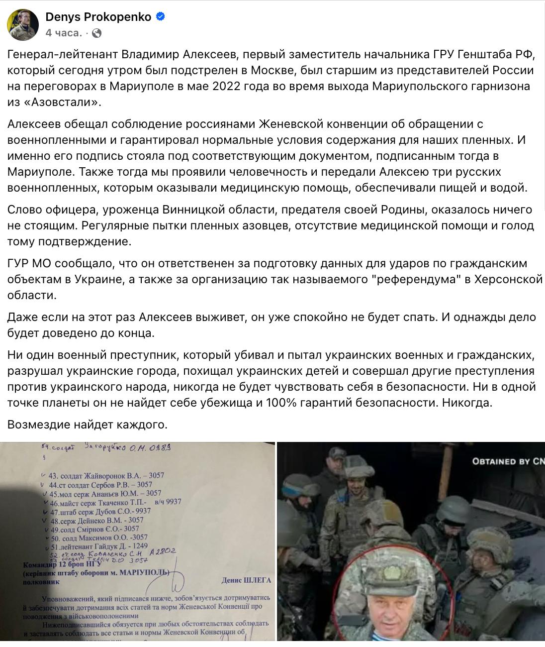 Покушение на первого замначальника ГУ ГШ генерала Алексеева внезапно прокомментировал, очевидно, тоскующий по подвалам и плену действующий «азовец» Денис Прокопенко.