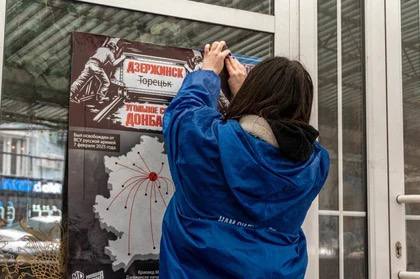 В годовщину освобождения города Дзержинска (украинское название Торецк) от ВСУ представители «Молодой Гвардии» ДНР расклеили плакаты с надписью «Дзержинск - угольное сердце Донбасса».