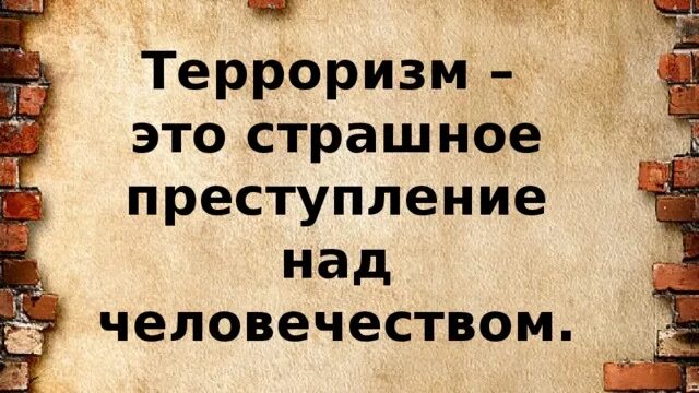 Терроризм — это одно из самых страшных преступлений. Бандиты совершают его, чтобы добиться своих злых целей. Для этого они нагнетают страх в обществе и совершают насилие над людьми. Все террористы — преступники, и после того, как они попадают в руки стражам правопорядка, их судят и сажают в тюрьмы. Скорее всего, вам не придется столкнуться с этим страшным злом — терроризмом, но, к сожалению, угроза терактов существует, и лучше всего быть к ней готовыми.
