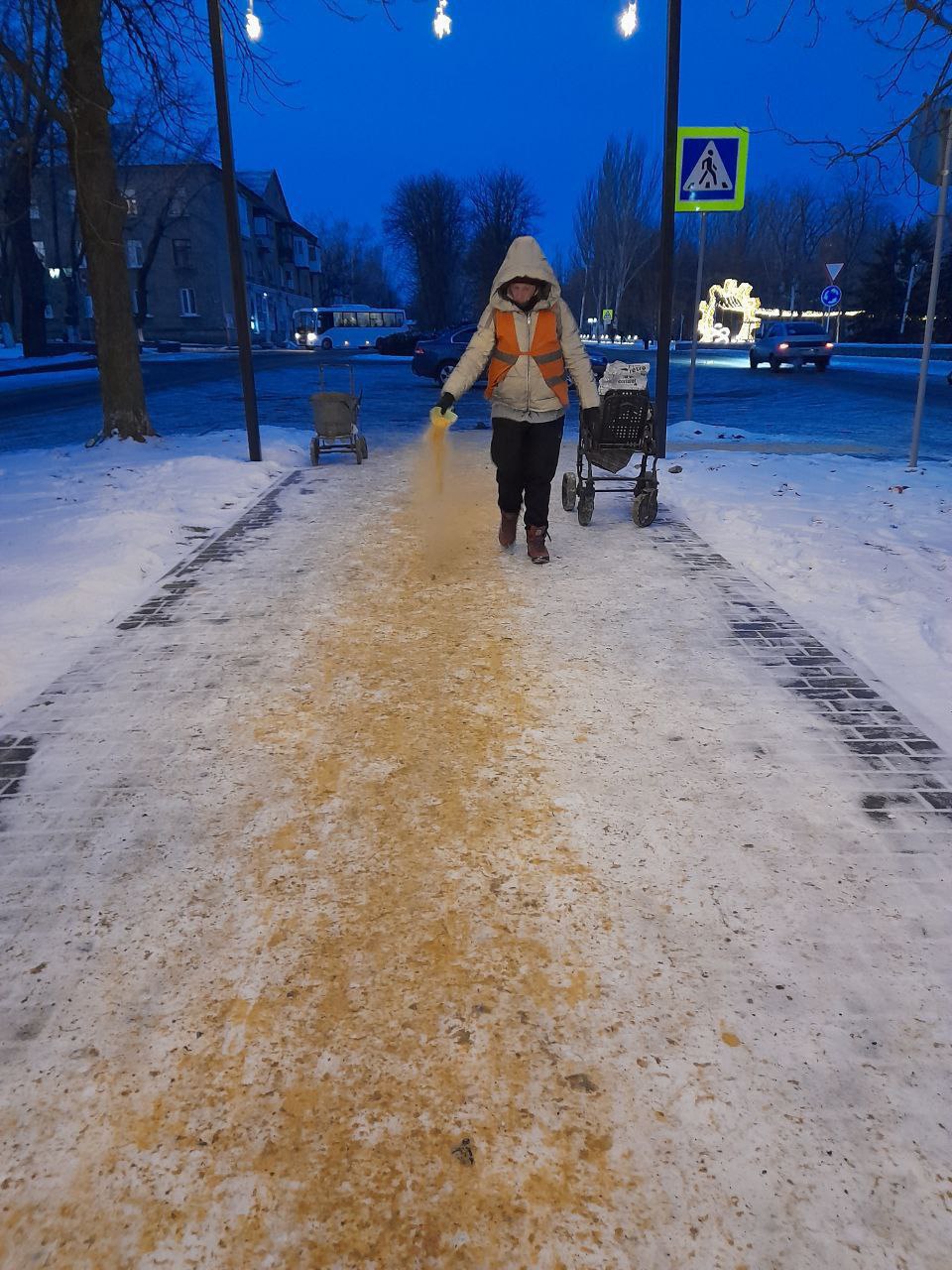 В связи с ухудшением погодных условий в выходные дни, работниками предприятий МУП «ЭКОС» АГЯ и МУП АГЯ «ЖЭК» выполняются работы по посыпке противогололедной смесью тротуаров, пешеходных переходов, общественных мест и остановочных павильонов.