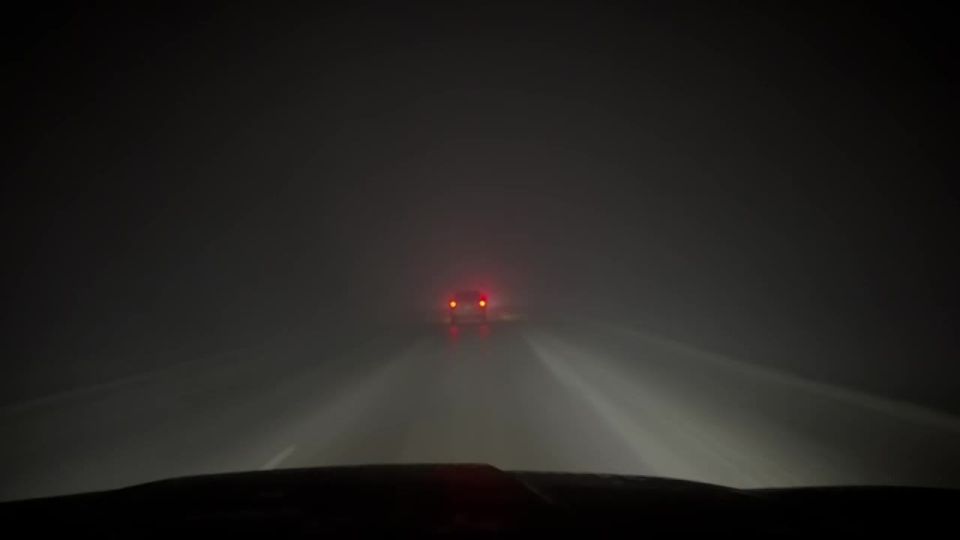 На гладкую ледяную блестящую дорогу опустился плотный туман. Даже просто, выходя из машины, ноги скользят вдаль сами по себе, а груженую-то машину дорога не держит вообще.