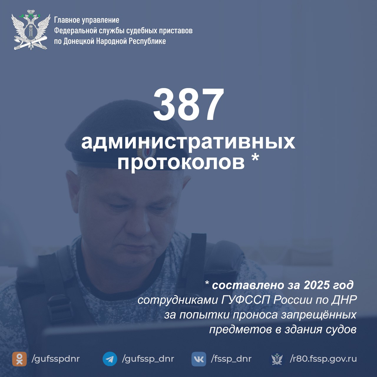 В 2025 году сотрудниками подразделений по обеспечению установленного порядка деятельности судов (ОУПДС) ГУФССП России по Донецкой Народной Республике было составлено 378 административных протоколов за попытки нарушения этого запрета.