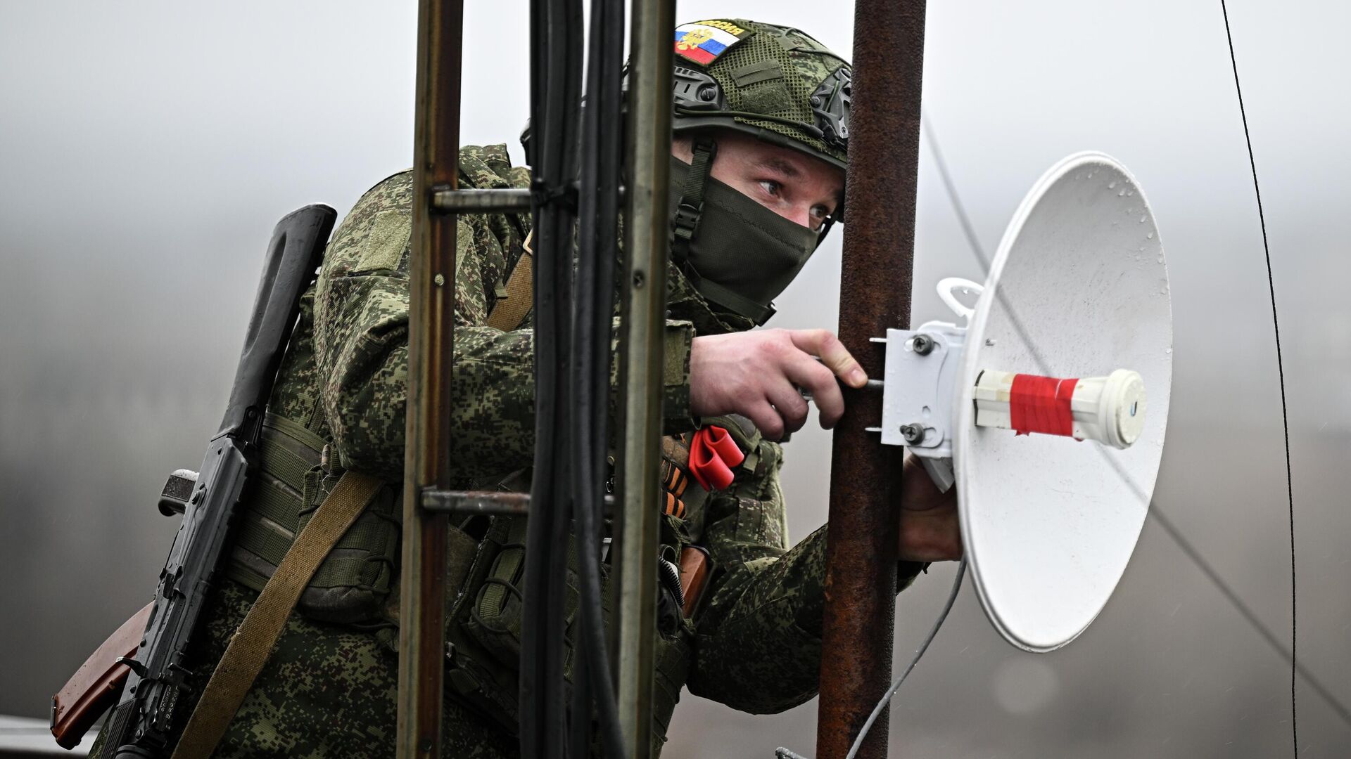 Владимир Разин дал развернутое описание того, как осуществляется связь на передовой. "По рации. Это радиосвязь с использованием всевозможных ретрансляторов, установленных на высотных зданиях или природных высотах", — начал объяснение военкор.