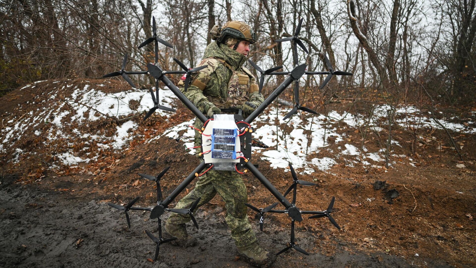 По его словам, грузоподъемность такого самодельного коптера составляет три мины калибра 82 мм. Эксперт сравнил его с трофейным украинским дроном "Вампир", который имеет большие габариты, но способен нести лишь на одну мину больше.