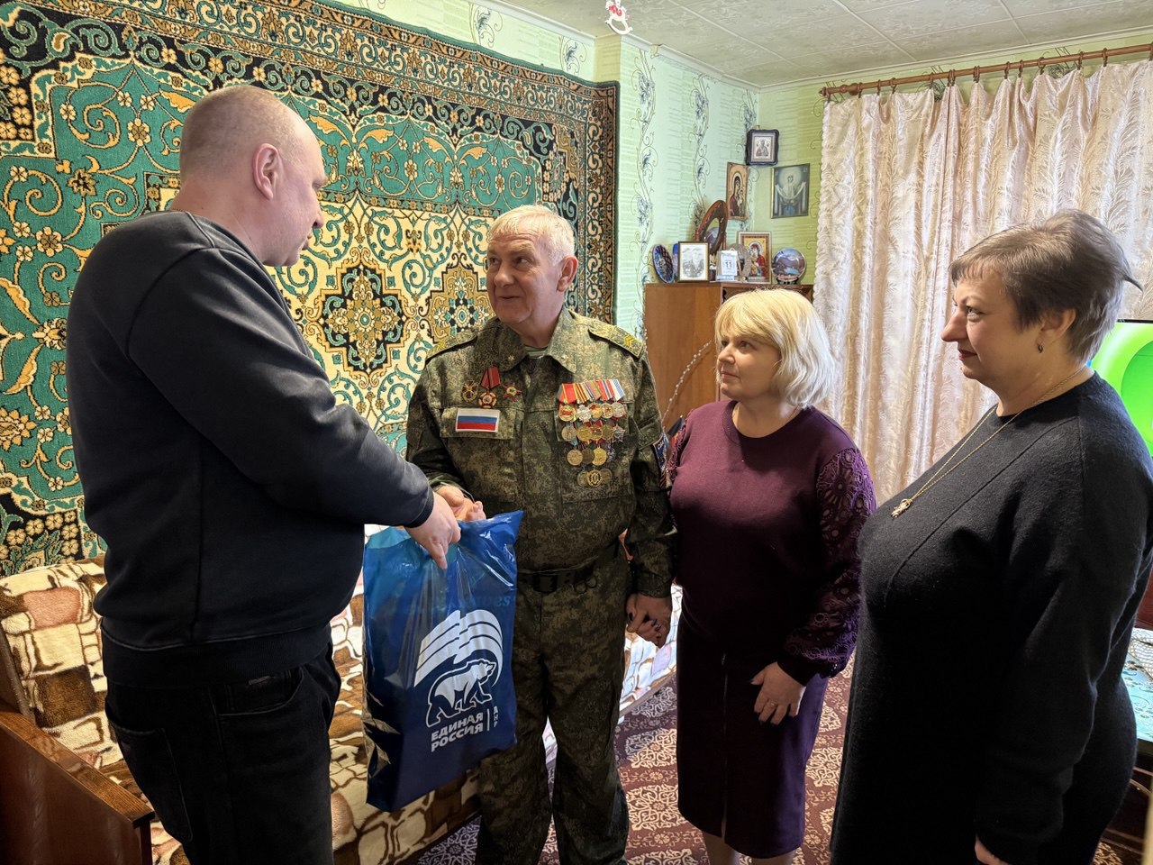 Гости поздравили Анатолия Анатольевича с памятной датой России, выразили слова благодарности и признательности за внесенный вклад в защиту Родины и вручили подарки: