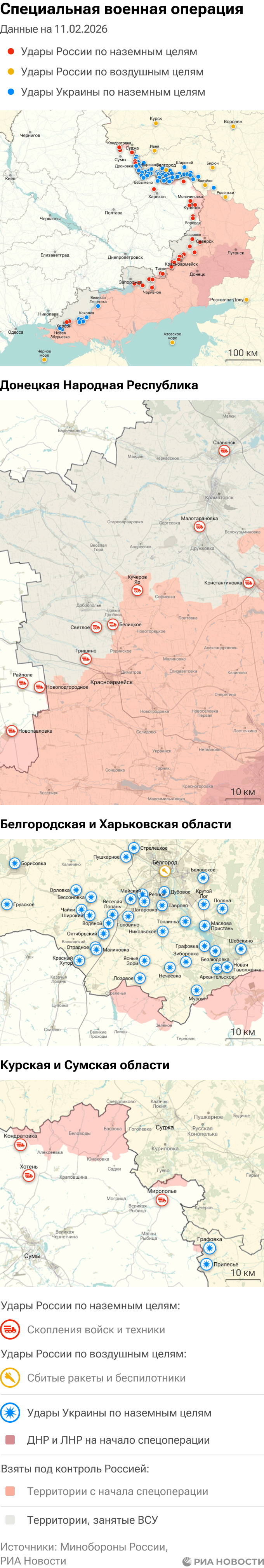 Российская армия с 24 февраля 2022 года проводит на Украине специальную военную операцию. Ее главной целью является помощь Донецкой и Луганской народным республикам, на территории которых с 2014 года не прекращались обстрелы. Перед российскими военными поставлена задача минимизировать потери личного состава и мирного населения при выполнении боевых заданий.Данные Минобороны и администраций новых регионов на 11 февраля 2026 года