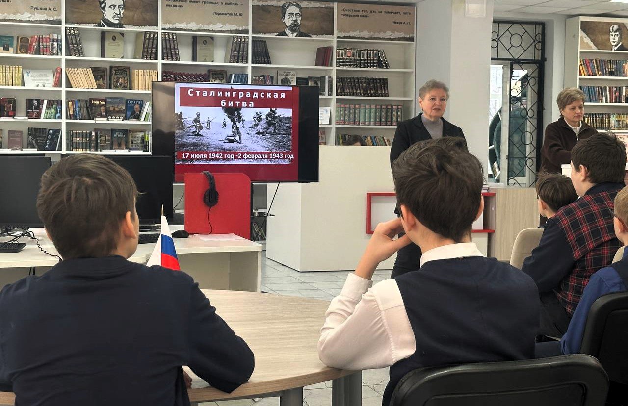 Юные слушатели узнали о подвигах защитников города на Волге, о стойкости и самопожертвовании, которые позволили одержать победу над фашизмом. Было подчеркнуто, что дух Сталинграда живёт и сегодня в сердцах наших воинов, которые продолжают бороться за свободу и независимость нашей Родины. Также ребятам был продемонстрирован видеоролик о современных героях, вставших на защиту своей Родины. Затем была проведена викторина, на которой они показали свою эрудицию, ответили на вопросы и обсудили исторические события. За правильные ответы они были награждены сладкими призами.