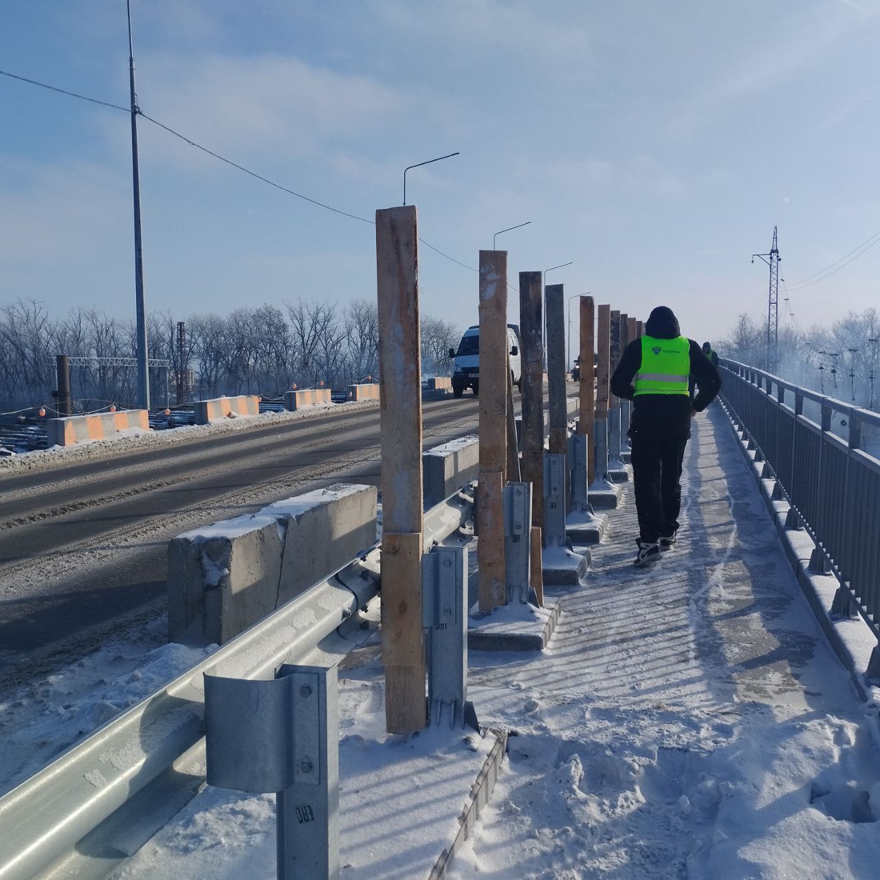 Параллельно специалисты демонтировали опалубку тротуарной части — освобожденные конструкции позволили двинуться дальше. Именно в январе активно бурились отверстия под анкерные шпильки для барьерного ограждения. Металлические стойки одно за другим занимали свои места: монтаж барьерного ограждения слева шел практически всю вторую половину месяца.