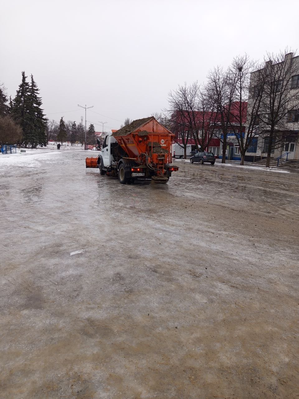 ГУП ДНР «ДОНСНАБКОМПЛЕКТ» проводятся работы по посыпке Центральной площади города Дебальцево посыпочным материалом в целях предотвращения гололёда и обеспечения безопасности пешеходного и автомобильного движения.