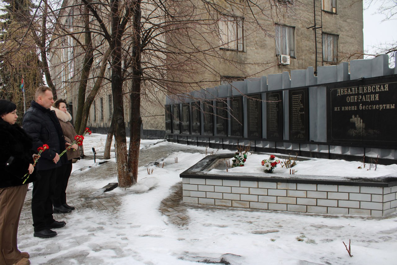 В городе-герое Дебальцево врио главы Краснолиманского м. о. Олег Пономарев совместно с председателем Краснолиманского муниципального совета Анжелой Заболотской возложили цветы к монументу «Дебальцевская операция. Их имена бессмертны».