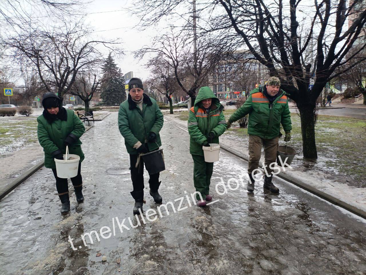 С утра сотрудники коммунального предприятия «Зелёное строительство» продолжают работать, посыпая тротуары и пешеходные дорожки во всех районах города.