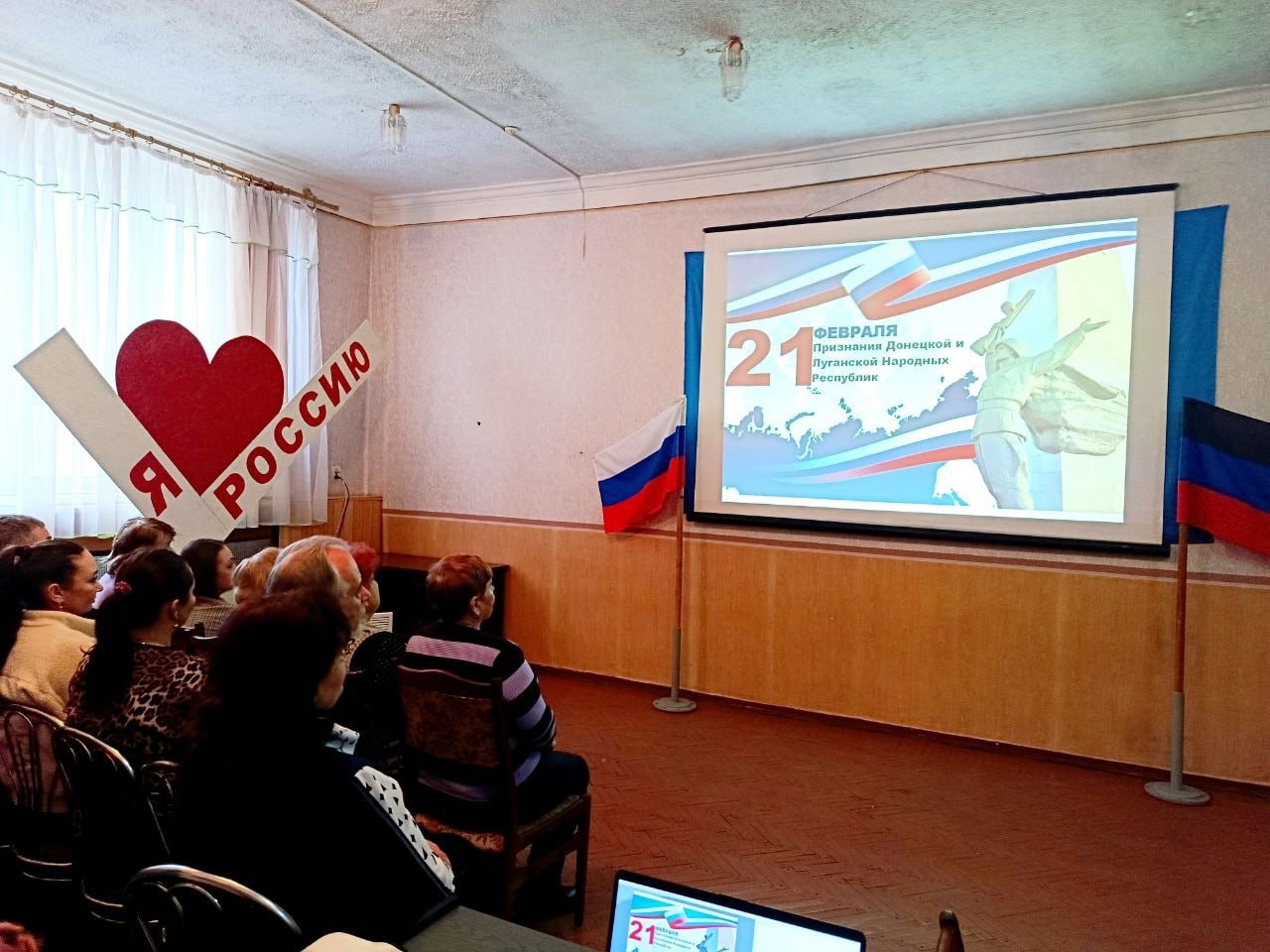 Сегодня во Дворце культуры «Лидиевка» прошёл информационный час, посвященный теме "Одна страна – одно будущее". Это мероприятие было приурочено к памятной дате – Дню признания Донецкой Народной Республики Российской Федерацией.