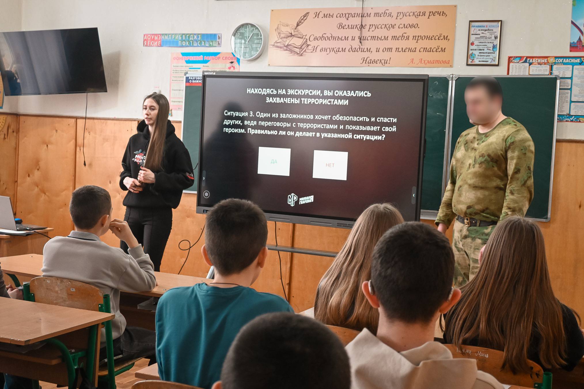 В рамках урока совместно с Росгвардией подробно рассказали о признаках экстремистской идеологии, методах вербовки и распространения запрещённой информации, а также о мерах личной безопасности и правилах поведения в случае возникновения чрезвычайных ситуаций.