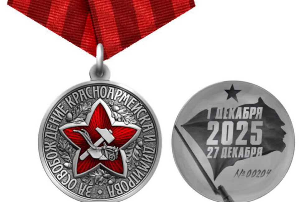 Указом утверждены Положение о награде, ее описание и рисунок, а также образец удостоверения. На лицевой стороне медали размещена эмблема Рабоче-крестьянской Красной армии образца 1918 года в обрамлении дубового венка. На оборотной стороне изображена пятиконечная звезда и даты освобождения Красноармейска (1 декабря 2025 года) и Димитрова (27 декабря 2025 года).