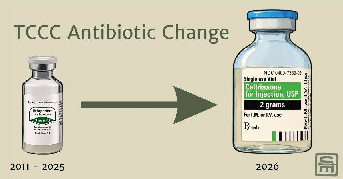 В конце 2025 года TCCC изменила свои рекомендации по парентеральному введению антибиотиков в Руководстве TCCC с 1 г внутривенного введения эртапенема один раз в день на 2 г внутривенного введения цефтриаксона один раз в день.