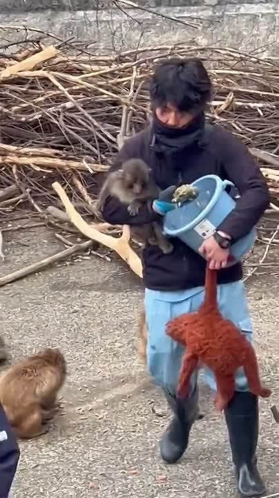 Обезьянку повысили. Теперь он помогает смотрителям зоопарка кормить своих собратьев.