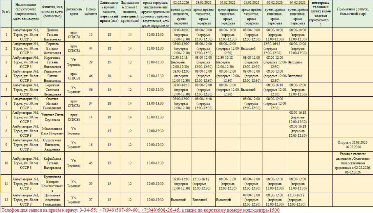 В рамках работы муниципального штаба по вопросам здравоохранения при администрации городского округа Торез, который был создан по поручению Главы ДНР Дениса Пушилина, администрация городского округа Торез информирует о графике приема пациентов врачами ГБУ ДНР "ЦГБ г.Тореза" с 02.03.2026- 07.03.2026.