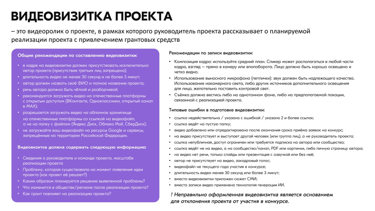 Не корректная видеовизитка. Это одна из самых распространённых причин у участников заочных и очных грантовых конкурсов Росмолодёжи. Возможные причины некорректности видеовизитки на слайде с Методических рекомендаций Росмолодёжь.Гранты.