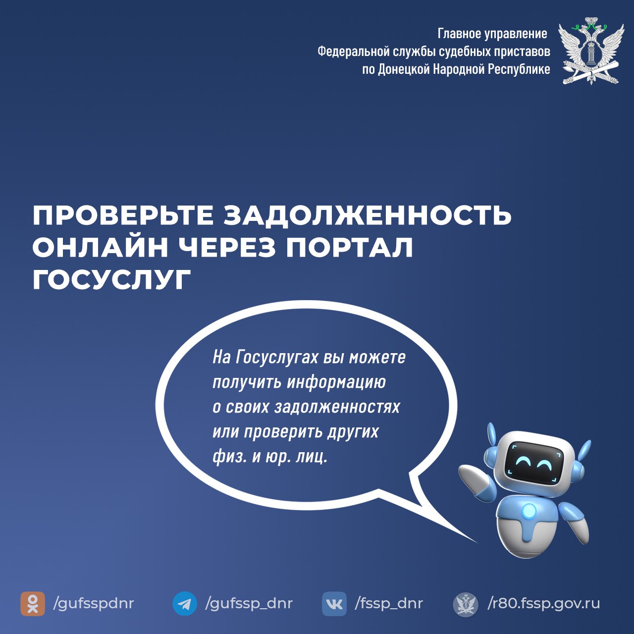 ГУФССП России по Донецкой Народной Республике информирует граждан и представителей организаций о возможности проверить наличие исполнительных производств на портале Госуслуг.