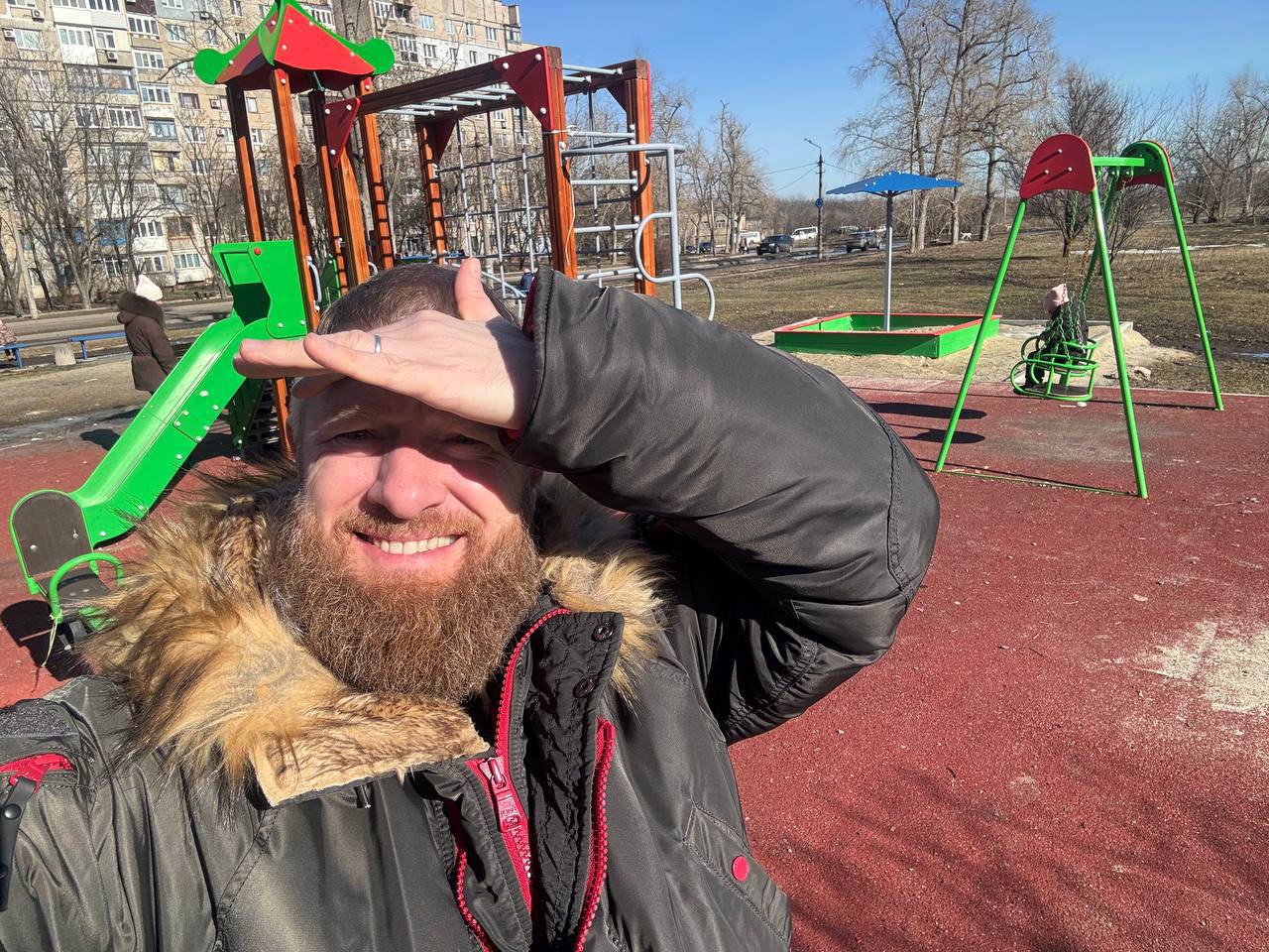 Проезжали мимо детской площадки, которую я открывал здесь в прошлом году. Это был мой личный подарок донецким детям на свой день рождения. Тогда хотелось сделать что-то по-настоящему нужное и живое – не для отчётов, а для ребят, которые растут в непростое время.