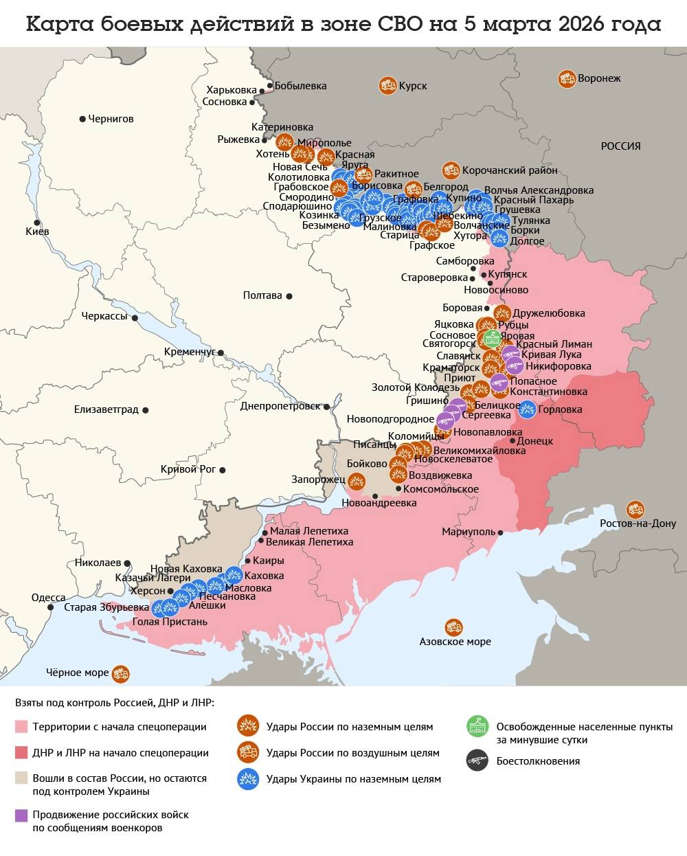 По данным Минобороны, ВС РФ 5 марта освободили населенный пункт Яровая в ДНР. Кроме того, военкоры сообщают, что наши военные начали штурм села Попасное на Константиновском направлении.