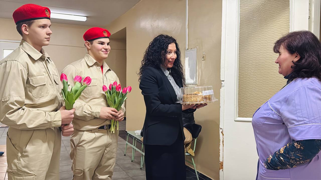 В преддверии Международного женского дня, в рамках направления «Доброслужащий», начальник отдела по делам молодёжи и спорта администрации Ясиноватского МО Яна Стукало вместе с юнармейцами отряда ГБОУ «Школа № 1 Ясиноватского МО» посетили госпиталь и поздравили медперсонал с праздником 8 Марта.