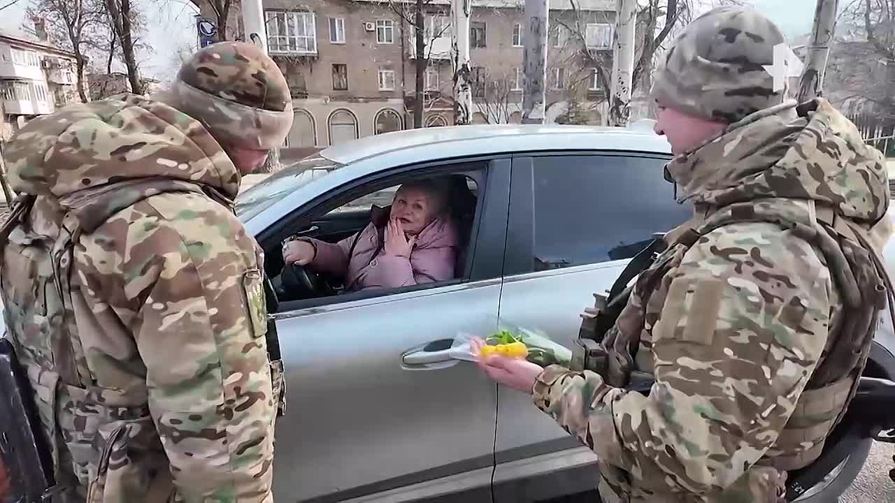 Открывая окно автомобиля навстречу мужчинам в форме с цветами, женщины улыбались. Некоторые даже послали военнослужащим воздушный поцелуй.