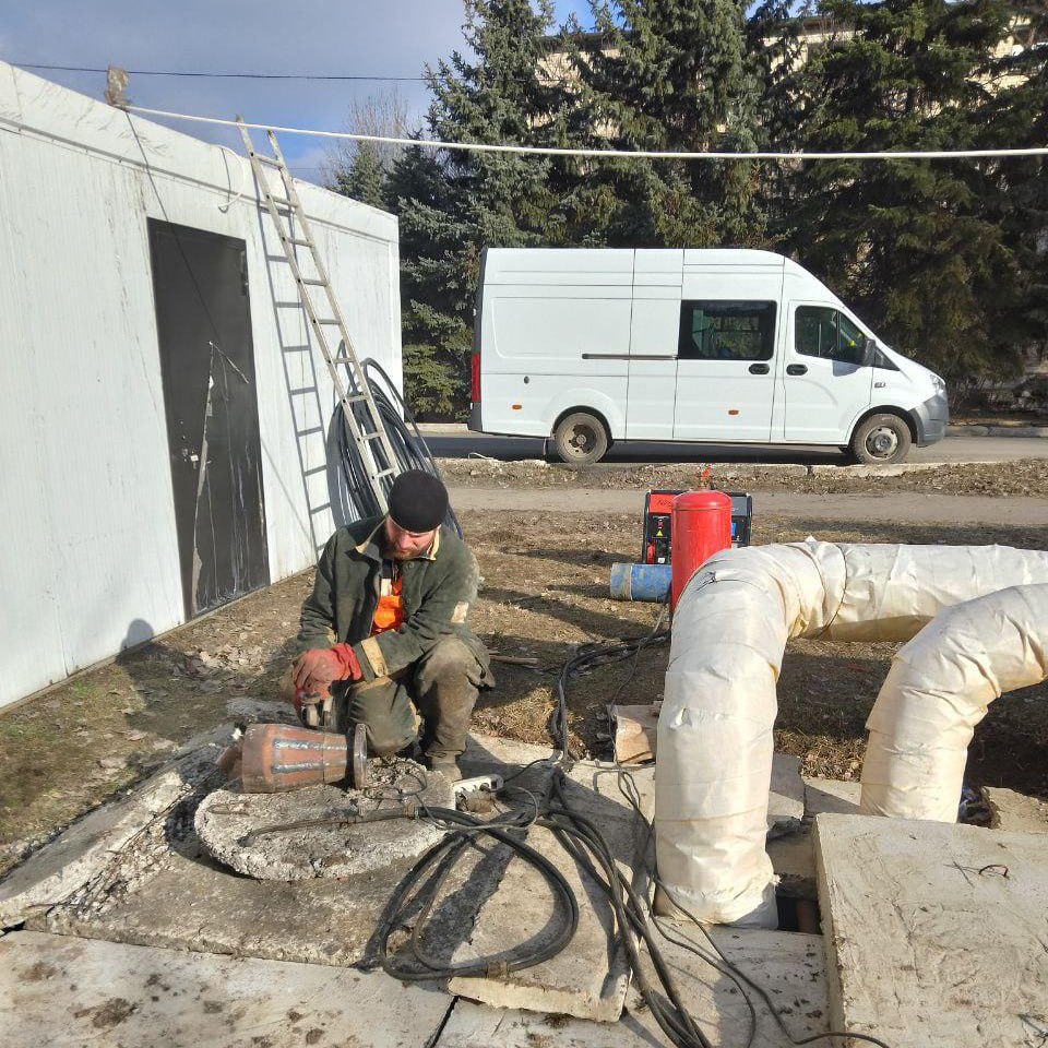 Аварийно-восстановительная бригада из Владимира совместно с аварийно-восстановительной бригадой из Магадана выполнили работы по врезке труб отопления и досборке для пуска в работу передвижного теплового пункта № 7 на улице Шахтерская в Кировском.