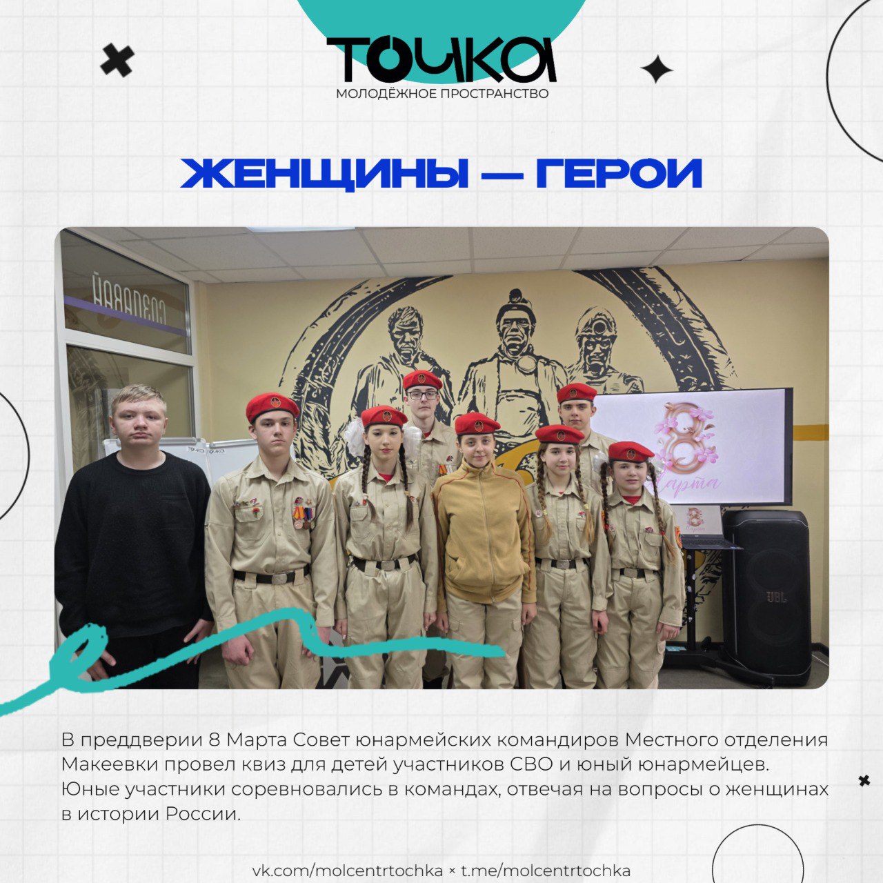 В преддверии 8 Марта в молодёжном пространстве «Точка» Совет юнармейских командиров Местного отделения городского округа Макеевка провел интеллектуальный квиз для юных юнармейцев и детей участников СВО.