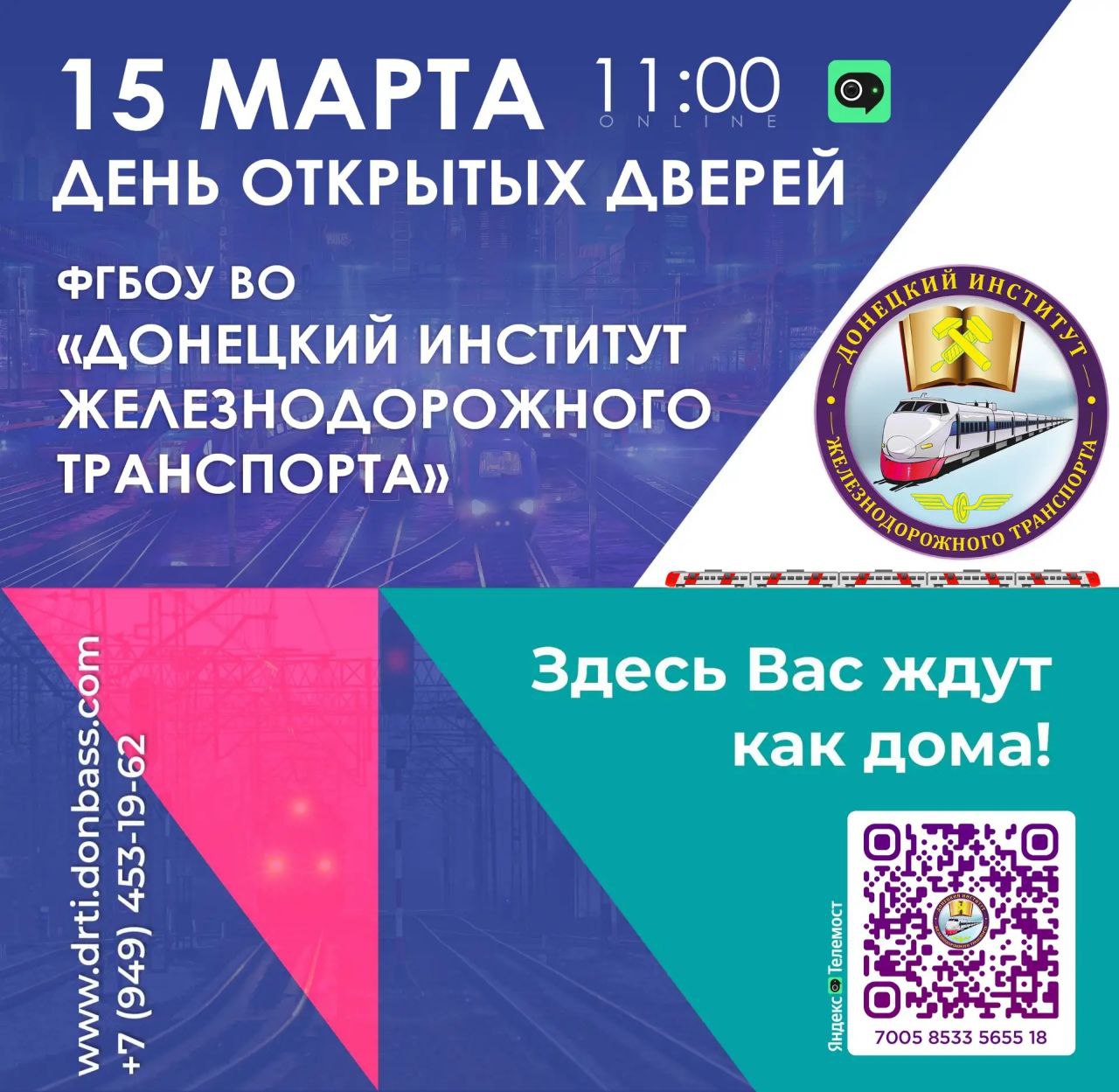 Устал гадать, куда поступать? Хочешь связать свою жизнь с железной дорогой? Узнай всё о поступлении, специальностях и студенческой жизни, не выходя из дома! Приходи на онлайн-встречу в ФГБОУ ВО «Донецкий институт железнодорожного транспорта» и получи ответы на все вопросы!