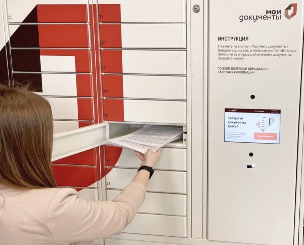 Чтобы получить документы в постамате, достаточно ввести PIN-код своего дела или предоставить QR-код, затем подтвердить выдачу кодом из СМС. После этого постамат автоматически выдаст готовый документ.