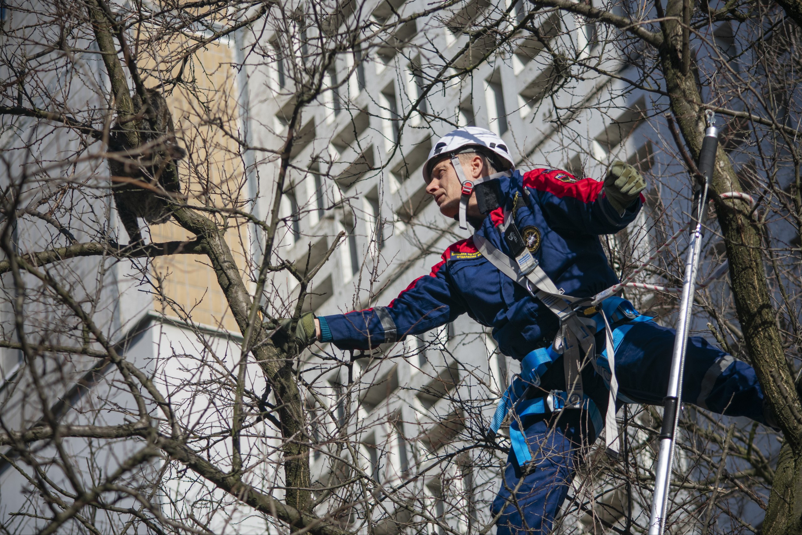 Родственник Чеширца, к сожалению, не умеет телепортироваться и, оказавшись столь высоко, вдруг обнаружил, что не может спуститься на землю. О своем незавидном положении пушистик стал громко сообщать на всю округу и был услышан неравнодушными жителями, которые и обратились к нам.