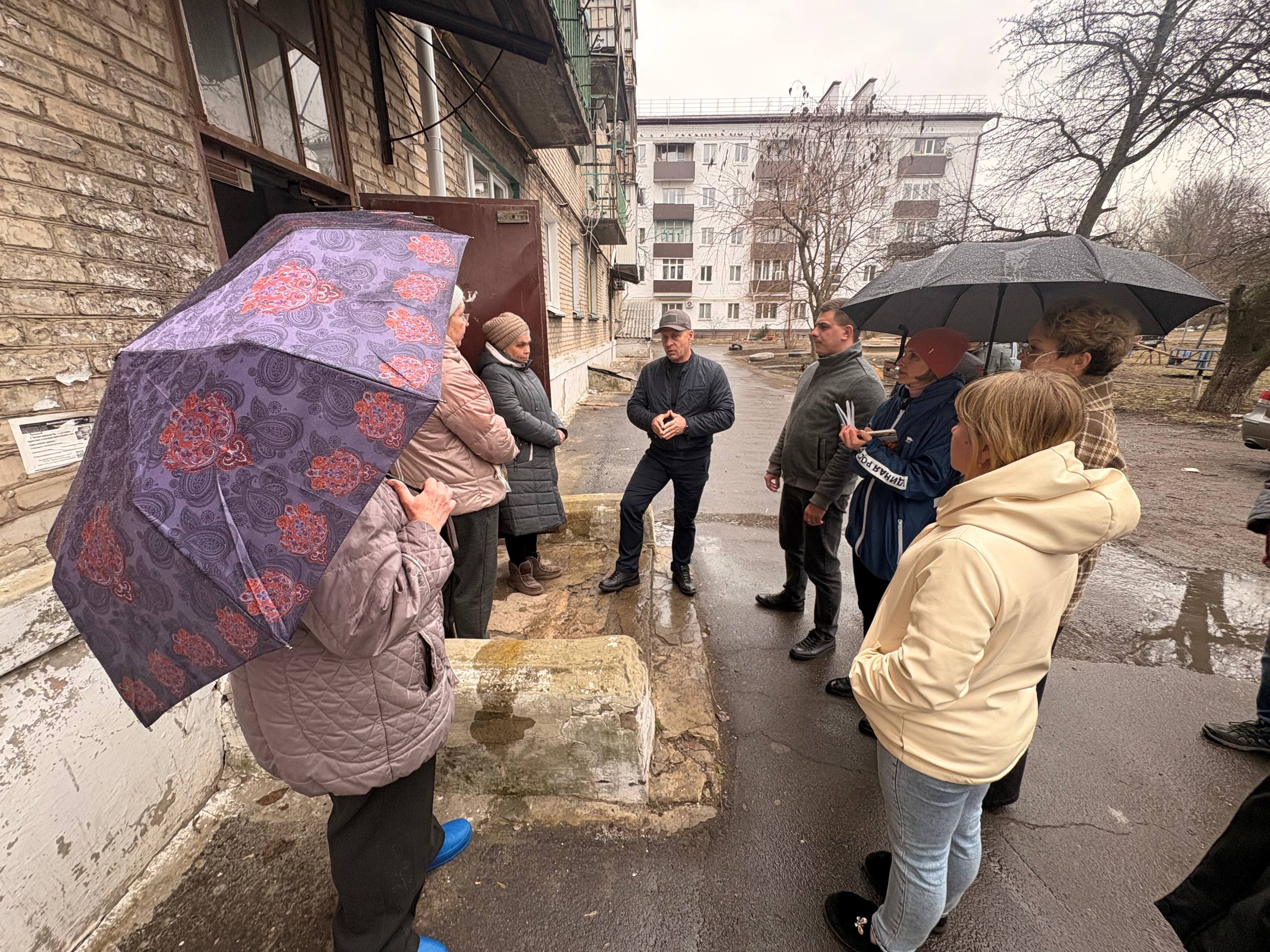 Что же касается существующих уже сегодня проблем, жители дома говорили об оставшейся после обстрела дыре в стене, через которую в квартиры затекает вода, о необходимости ремонта козырьков над выходами в подвальное помещение. Из-за их аварийного состояния после дождей и таяния снега подвал заполняется водой и стены в квартирах сыреют. Также жители дома рассказали о том, что сами заботятся о своем дворе, и субботники проводят. Вот только мусор вывозить некому. Поручил «Эко-Комфорт-Сервису» организовать вывоз мусора со двора, а также убрать оставшийся после ремонта дома строительный мусор со стороны улицы.