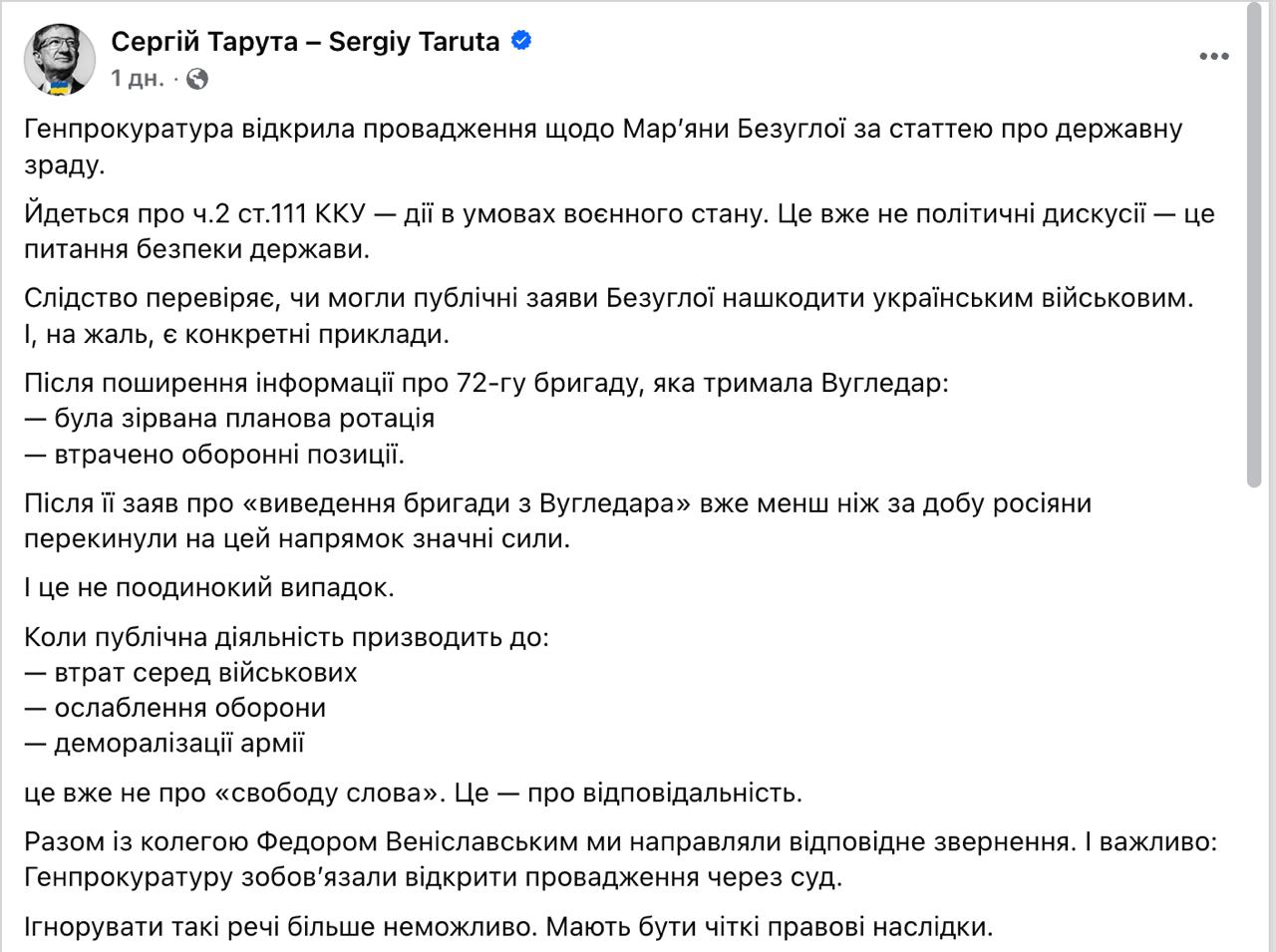 В суд на нее подал депутан от партии Тимошенко Сергей Тарута - бывший донецкий оранжевый олигарх и одно время губернатор украинской Донецкой области Сергей Тарута. Он решил, что рассказанная Безуглой правда нанесла очень серьезный ущерб ВСУ