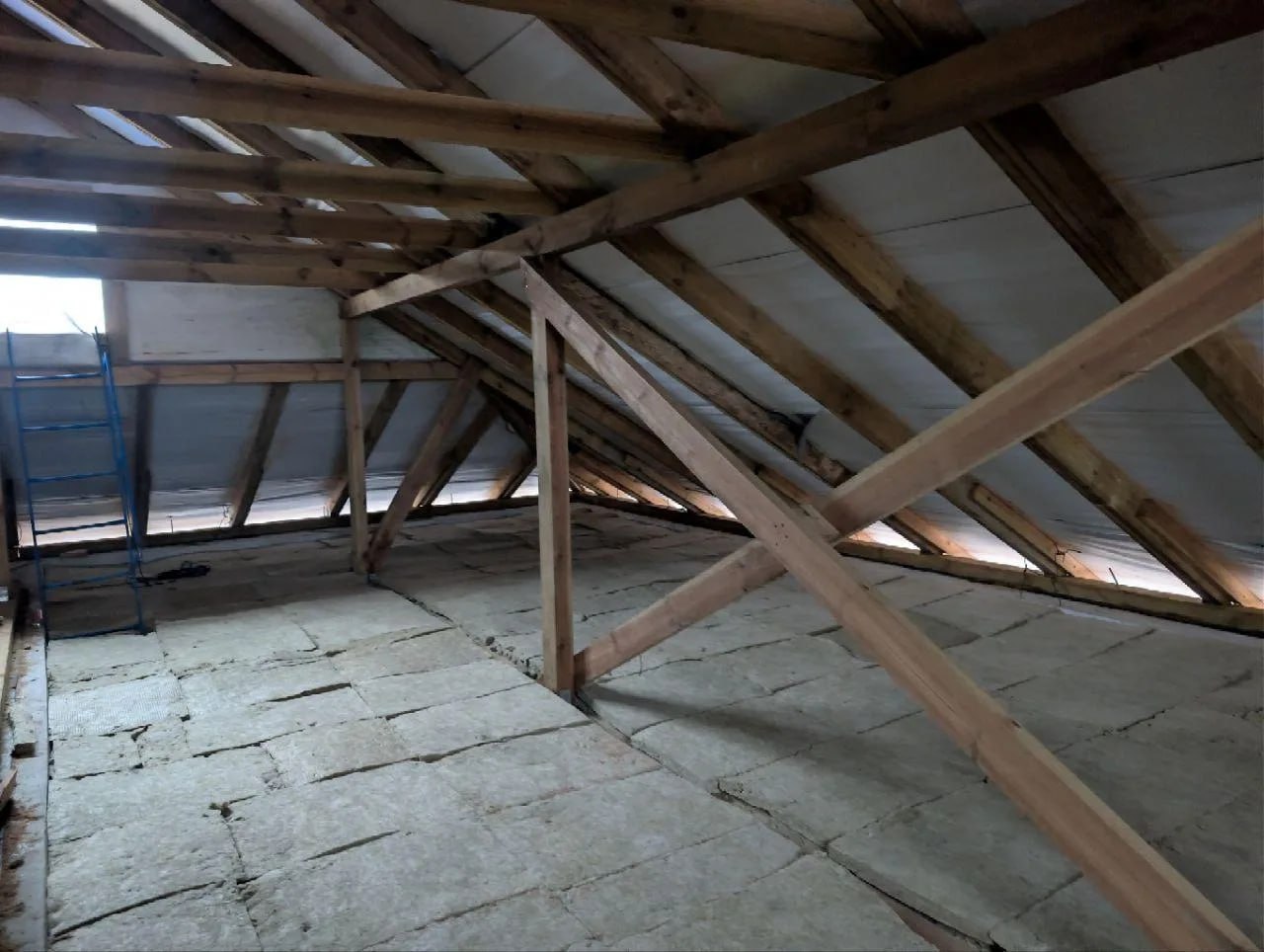 На чердаке помещения специалисты уложили утепляющие маты и смонтировали пароизоляцию.