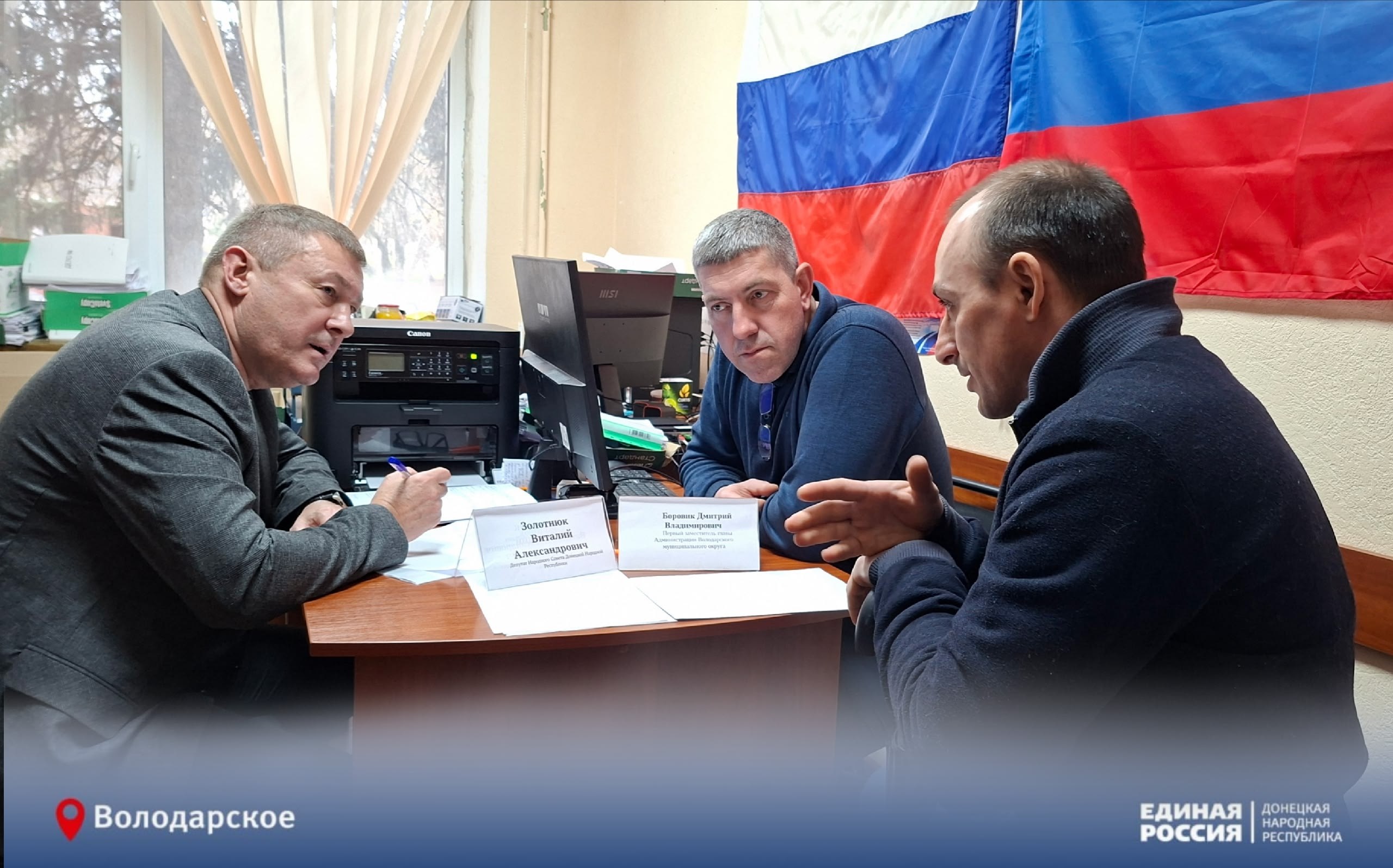 24 марта в общественной приемной партии "ЕДИНАЯ РОССИЯ" провели прием граждан Первый заместитель главы Администрации Володарского муниципального округа Боровик Д. В. вместе с депутатом Народного Совета ДНР Золотнюком В.А.