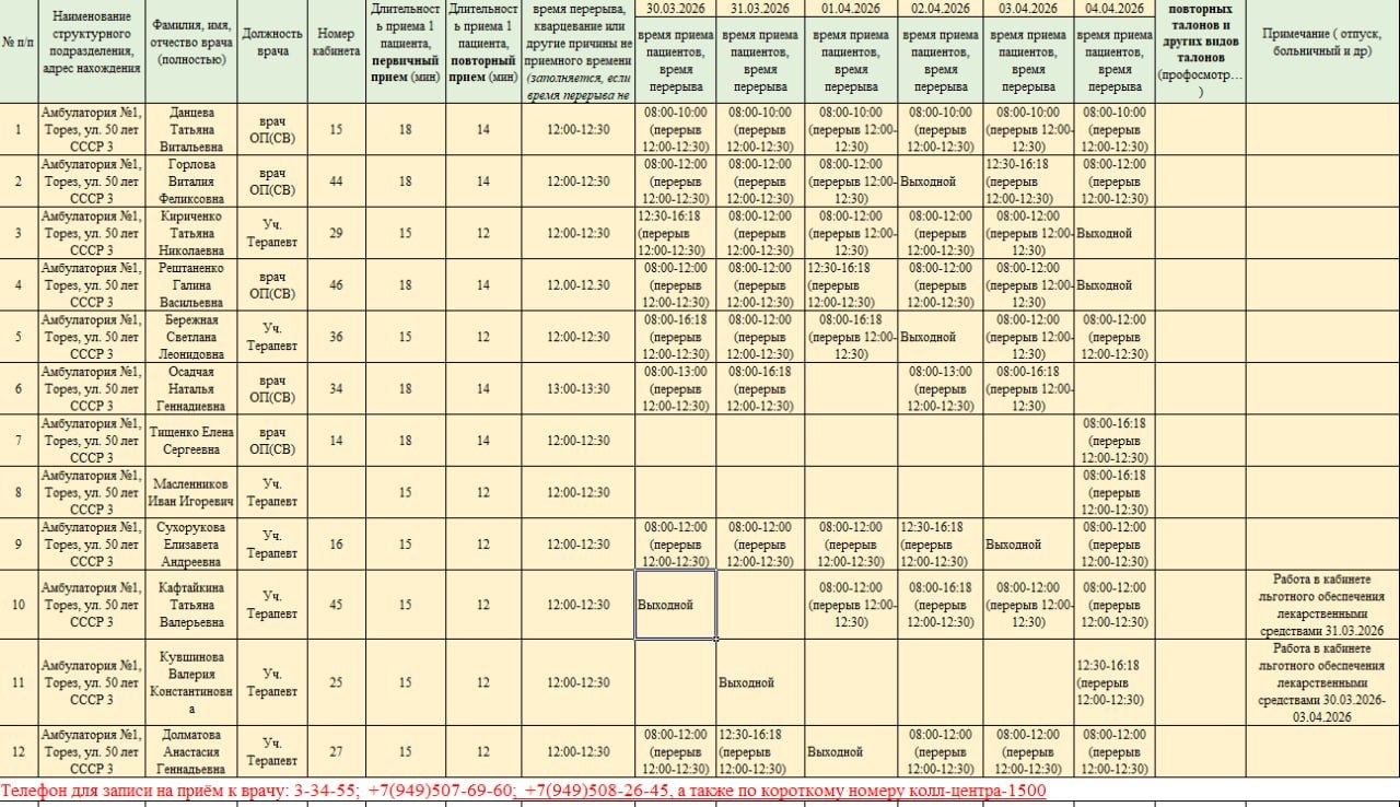 В рамках работы муниципального штаба по вопросам здравоохранения при администрации городского округа Торез, который был создан по поручению Главы ДНР Дениса Пушилина, администрация городского округа Торез информирует о графике приема пациентов врачами ГБУ ДНР "ЦГБ г.Тореза" с 30.03.2026- 04.04.2026
