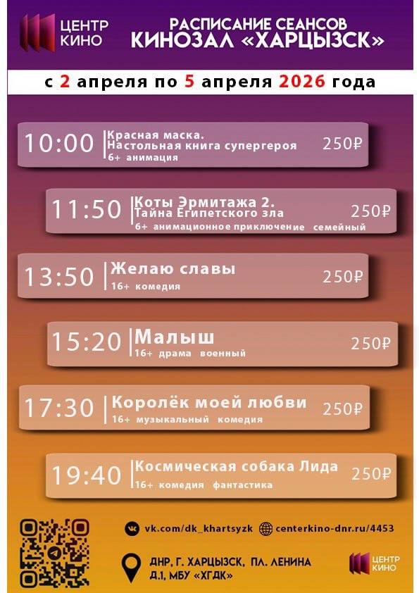 Расписание сеансов в кинотеатрах «Харцызск» и «Трубник» с 2 по 5 апреля 2026 года