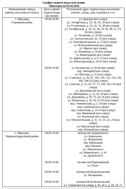 Сегодня, 2 апреля, в Макеевке будет организован подвоз воды для жителей, в дома которых не поступила вода в установленный графиком день.