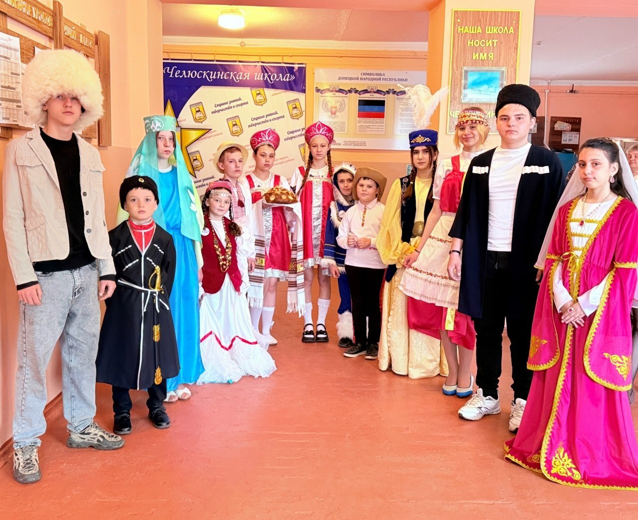 Мероприятие началось с торжественной встречи гостей: ученики в национальных костюмах приветствовали участников, рассказывали о традициях разных народов и вручали памятные значки как символ дружбы и единства.
