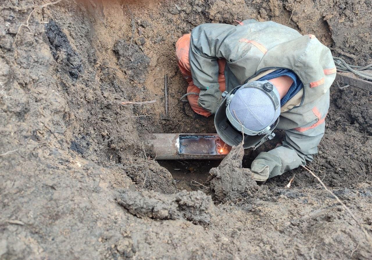 Специалисты разработали котлован, вырезали поврежденный фрагмент трубы и с помощью сварки установили новый.