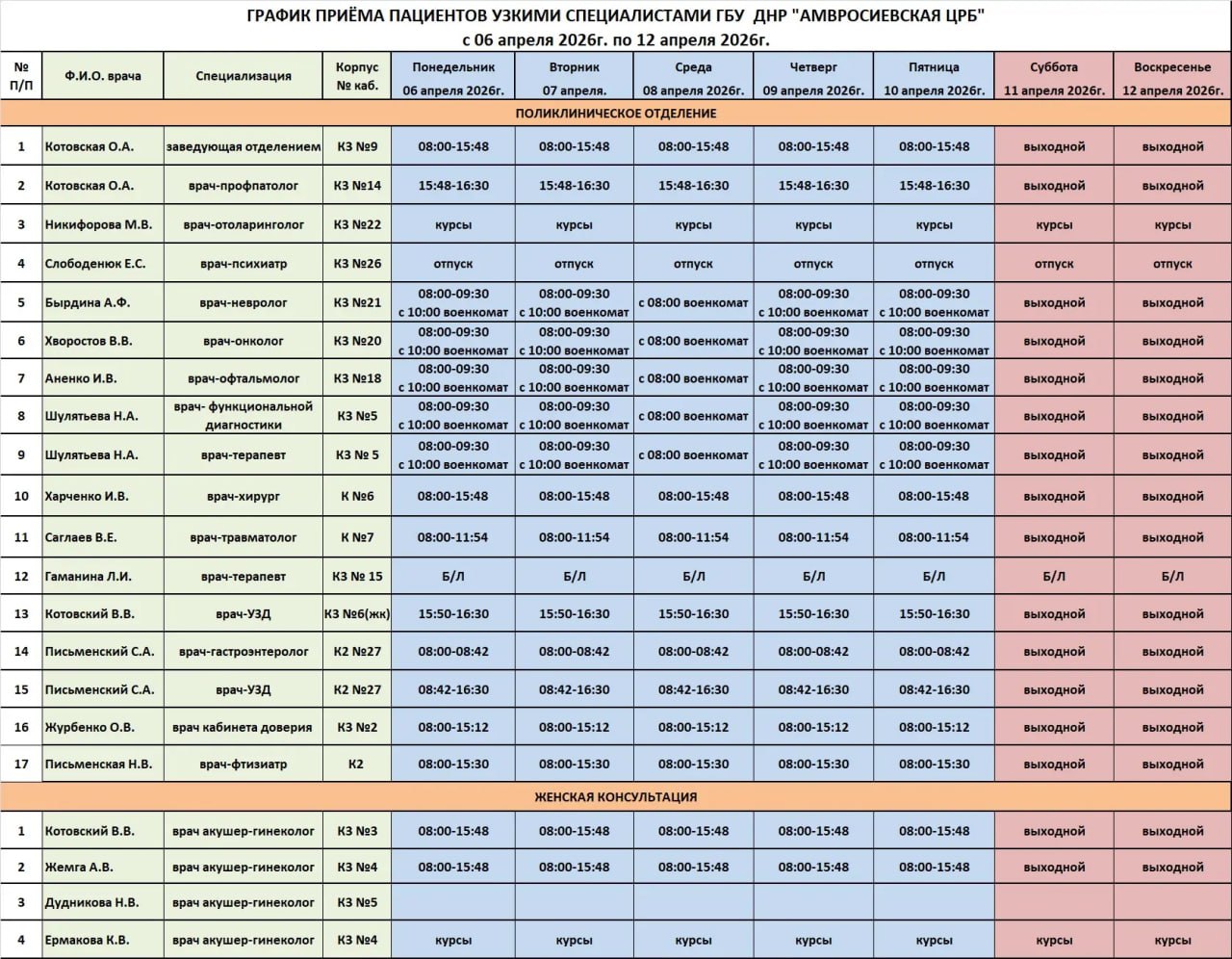 График приема врачей поликлинического отделения ГБУ ДНР "Амвросиевская ЦРБ"